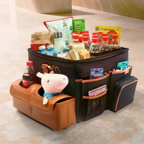 Large compartment with a removable divider, eight side pockets and two front pockets can hold everything you need on the road – from drinks to gadgets. It is suitable for all car models, and you can use it in your front seat, back seat, or even in the trunk. Plus, the lid works as a backseat table!