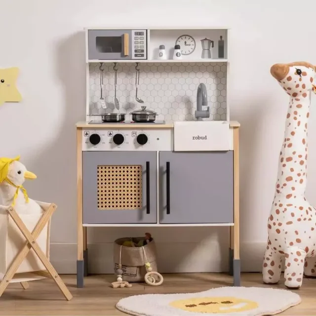 The Classic Gray Wooden Play Kitchen Set is built to withstand years of active play. Made from durable MDF and premium wood, it’s a sturdy, safe, and secure option for your child’s playtime. The ample storage space, including a top microwave and large cabinet, allows children to organize their kitchen accessories and keep their play area tidy.