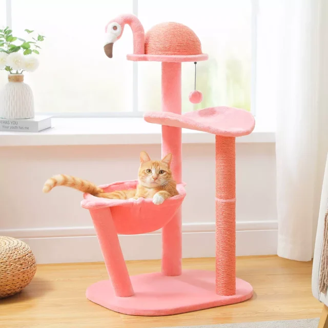 Inspired by the graceful stance of a flamingo, this multi-level cat tree is more than just a piece of pet furniture – it’s a playground, a scratching haven, and a cozy resting spot all in one. The durable sisal-covered scratching posts satisfy your cat’s natural scratching instincts, while the spacious platform and plush hammock provide a comfy place to rest and observe their surroundings. The flamingo-shaped plush toy adds a playful touch, making it an exciting adventure every day.