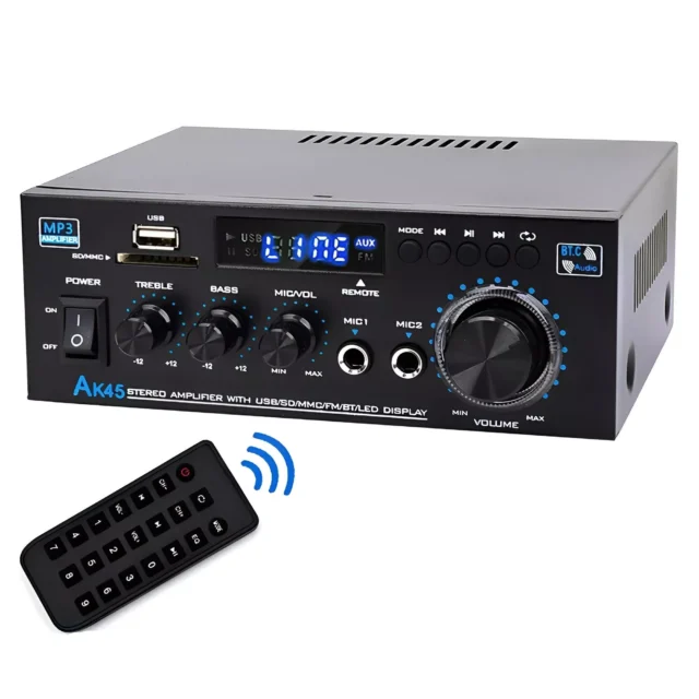Compact yet packed with features, it supports Bluetooth, AUX, USB, TF card, SD card, FM radio, and even dual microphone inputs, making it an all-in-one solution for your entertainment setup. With its sleek black design and easy-to-use front controls for treble, bass, and volume, this amp looks as good as it sounds.