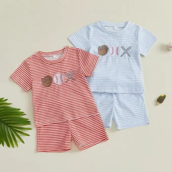 Boys Baseball Embroidery Shorts Set with Striped Drawstring Shorts