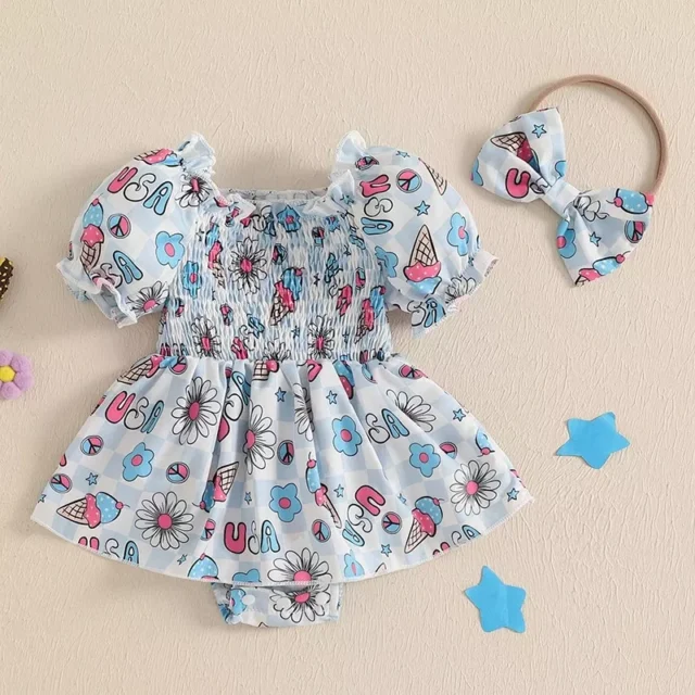 Get your little one ready for a fun-filled Fourth of July with this Newborn Baby Girl Fourth of July Outfit! Featuring a cute puff-sleeve smocked romper, this adorable outfit comes with a matching headband to complete the look. The all-over patriotic print celebrates the holiday in a charming and festive way, making it perfect for family gatherings, parades, or backyard BBQs. Designed for comfort and style, this romper will have your baby looking her best as she celebrates in style.
