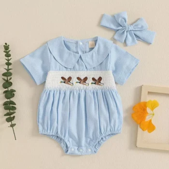 Baby Girl Summer Romper with Duck Embroidery & Doll Collar Headband Set