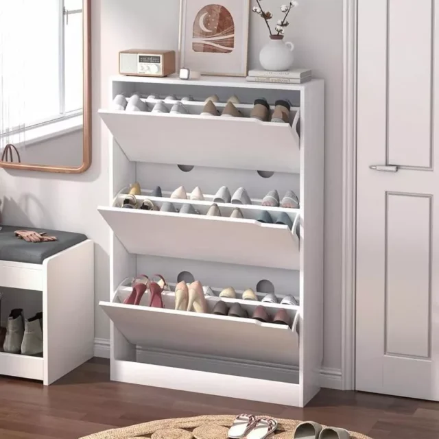 Don’t let your shoes take over your space. This white shoe cabinet will help you reclaim your entryway with its smart design and ample storage. Organize your shoes while adding a touch of modern style to your home. Its durable build and functional design make it an excellent investment for anyone looking to create a tidier, more organized space. Order yours today and experience the difference a well-organized entryway can make!
