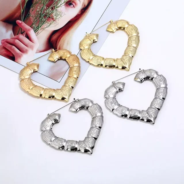 Elevate your style with these gorgeous Trendy Heart Bamboo Hoop Earrings. Designed to make a statement, these earrings blend classic elegance with modern flair. Crafted from high-quality stainless steel, they are available in both gold and silver finishes, offering versatility to complement any outfit. The heart-shaped design brings a playful yet sophisticated charm, making them a perfect accessory for women who love to stand out. Whether you’re dressing up for a special occasion or adding a touch of elegance to your everyday look, these earrings are the perfect choice.
