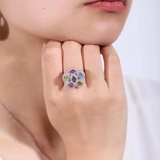 This cocktail ring is not just a piece of jewelry; it’s a statement. The natural gemstones in shades of purple, green, and yellow create a harmonious blend of colors that represent elegance, vitality, and positivity. The prong setting allows each gemstone to shine individually while also enhancing the overall design. Whether you’re dressing up for a fancy dinner or simply want to add a touch of class to your everyday wear, this ring is sure to complement your personal style.
